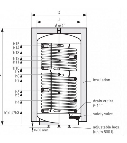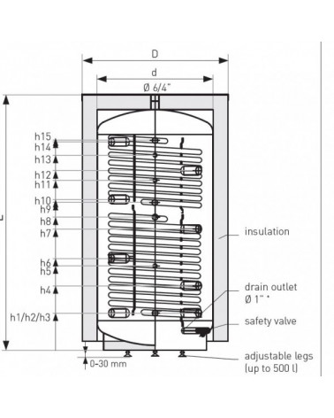 Hauteur arrivée d'eau supérieure, échangeur supérieur diam 1" pour h15 : 1600 mm