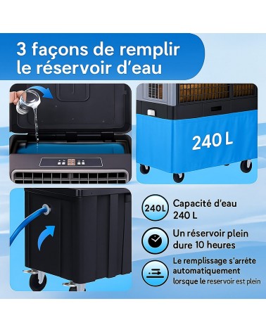 Principe de fonctionnement adiabatique : Le refroidissement adiabatique exploite un processus naturel vieux comme le monde. L'eau contenue dans le réservoir de 145 litres est pompée vers des panneaux absorbants (pads). Un ventilateur axial de 620W aspire l'air ambiant chaud et sec, le faisant passer à travers ces panneaux humides. L'évaporation de l'eau absorbe la chaleur de l'air, produisant ainsi un flux d'air rafraîchi et légèrement humidifié. Ce processus consomme jusqu'à 80% moins d'énergie qu'un climatiseur traditionnel.